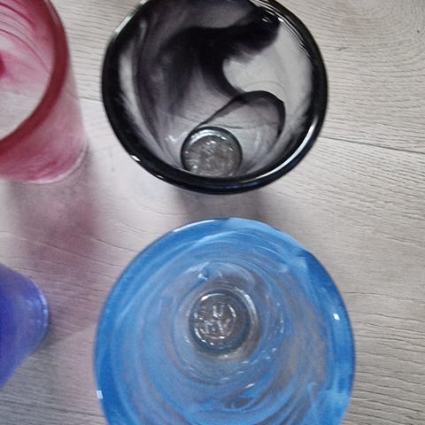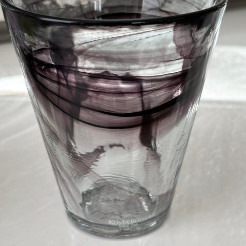Kosta Boda glass «Mine», design Ulrica Hydman Vallien. 2 stk blå og 2 stk rosa glass i bølgende design. De er rosa selv om fargen kan se litt rød ut på bilder.