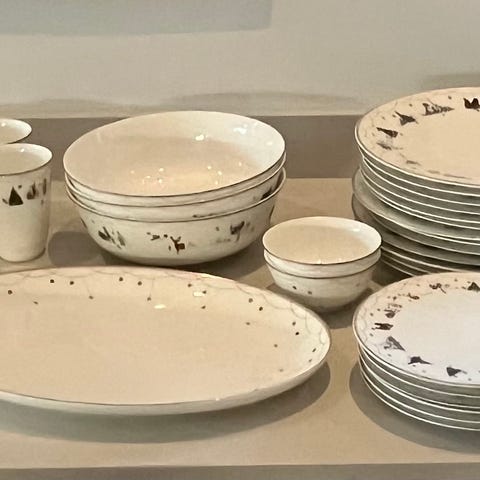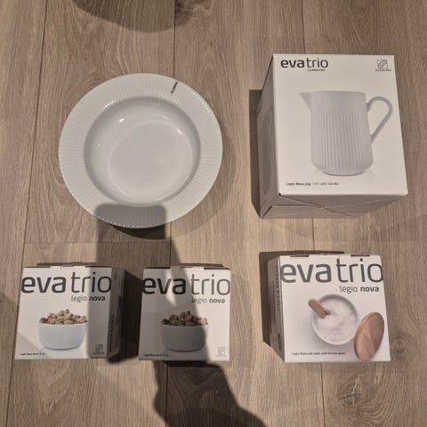Nydelig servise fra Magnor, Tokyo origami serien. Noen av skålene har falmet print i bunnen, se bilde. Ene skålen kom uten print.
