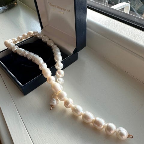 Selger en halskjede av store ferskvannsperler med en kjult lås. Denne har jeg arvet og vet at det har vært svær dyr.