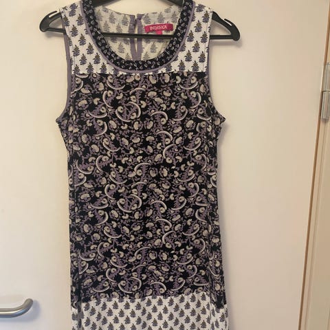 Indiska hverdagskjole i størrelse M, svart farge og laget av viskose. Kjolen har ermer og en enkel design som passer til daglig bruk, men også fest/pent. "Den lille sorte". Nydelig drapering på den ene siden av livet som gir en fin silhuett. Vises ikke så godt på bildet med hvit bakgrunn. Har tatt et nærbilde (grønn bakgrunn).