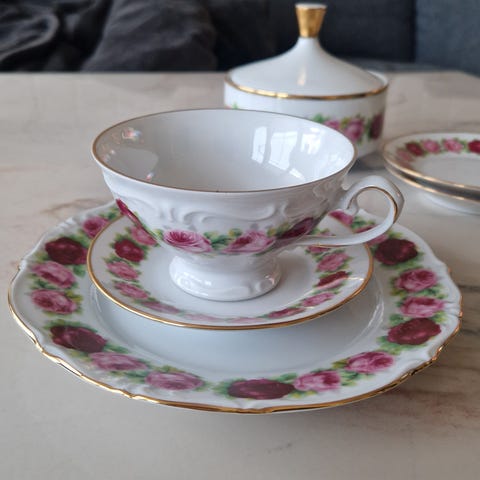 Engelsk tesett.Wild flowers.6 trio.Flott stand.Pris 250 kr per kuvert.