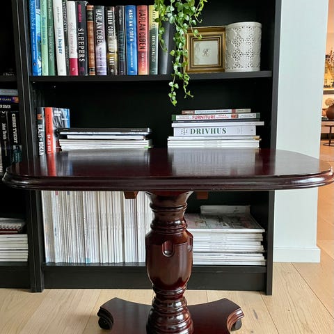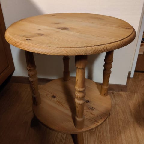 Bordet er ovalt i formen og har en god størrelse som er lett å plassere. Bordet er blitt malt hvit en gang i tiden. Har en enkel stil men gjør litt ut av seg. Små bruksmerker.