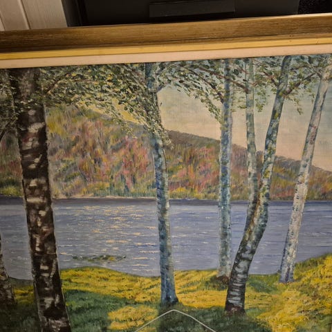 Maleri som viser et landskap med innsjø omgitt av skog og fjell. Bildet har en ramme i tre og viser en naturlig scene med blå himmel og grønne trær.