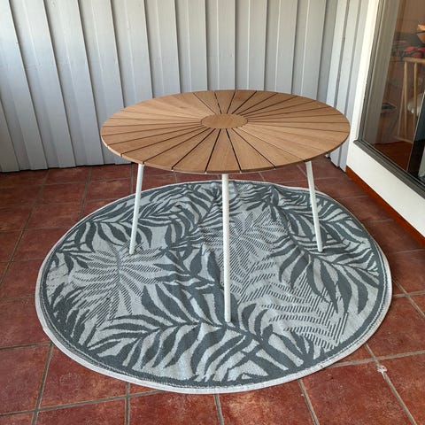 Rundt metallbord med grå farge. Bordet har en mesh-plate og fire ben med kryssforsterkning. Egnet som sidebord eller til utendørs bruk.