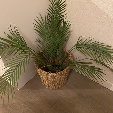 IKEA kunstig plante med dekorativ kurv. Planten har grønne blader og er egnet for innendørs bruk som dekorasjon.