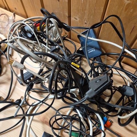 Selger en eske med mange ulike ledninger, adaptere og kabler. Esken er usortert. Inneholder både nye kabler i emballasje og brukte