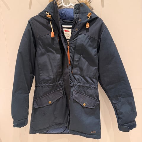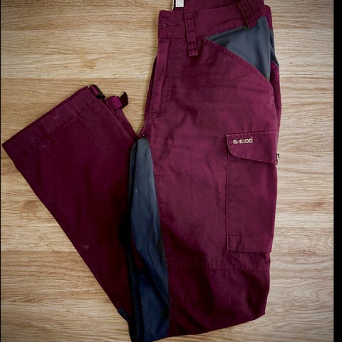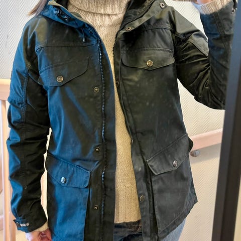 Kun brukt noen få ganger. Ingen slitasje, men enkelte mindre merker (se bilder). Ikke vasket eller behandlet med voks. Jeg vil beskrive fargen som rustrød. Størrelse S. Romslig modell.