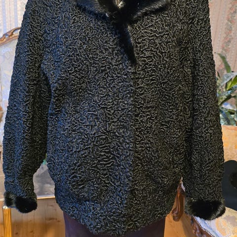 Klassisk shearling jakke i ekte saueskinn. Skinnknapper. Hentes på Vinderen eller sendes