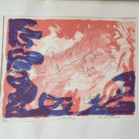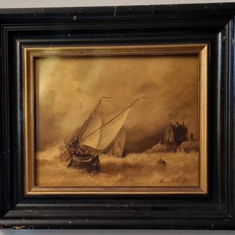 Maleri som viser et landskap med innsjø, skog og himmel. Maleriet er innrammet i en enkel, gyllen ramme. Motivet inkluderer trær og blomster i forgrunnen, med en naturlig og rolig atmosfære.