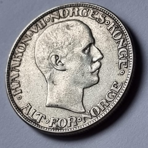 Norge 2 Kroner mynt fra 1917 laget i sølv. Mynten har portrett av kong Haakon VII på den ene siden og riksvåpen med forskjellige norske symboler på den andre siden. S. Høysbydne over 2000