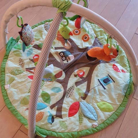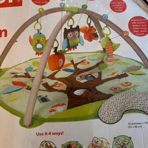 Skip hop babygym selges da den ikke brukes lengere. Brukt av 4 barn og har derfor mistet noe av fargen etter vask samt fått noen streker på speilene. Alle lekefunksjoner fungerer fortsatt