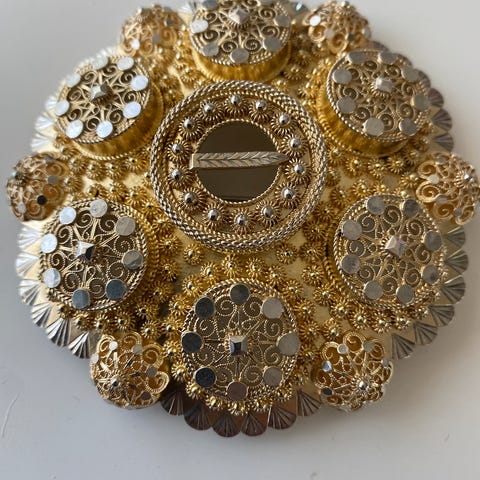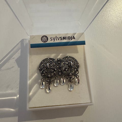 Selger en stor og dekorativ sølje fra Sylvsmidja, laget i oksidert sølv med klassisk filigranarbeid, speil/skåler og mange heng.