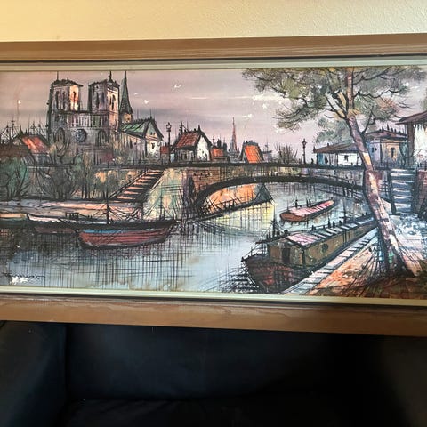 Maleri som viser et slott omgitt av trær og vann, innrammet i en enkel trefiner ramme. Passer til dekorasjon i hjem eller kontor.