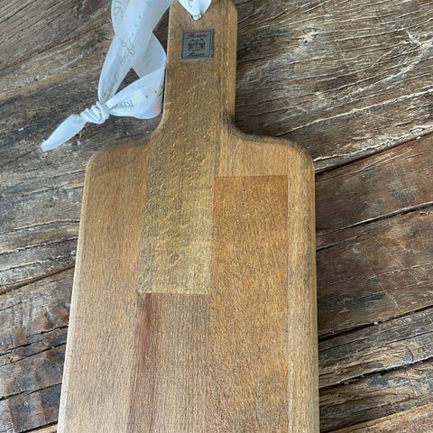 Rustikt og dekorativt brett i hvitmalt tre med håndtak og lærhempe. Passer perfekt som pynt på kjøkkenet, til styling, servering av ost/kjeks – eller som underlag for lys og dekor.