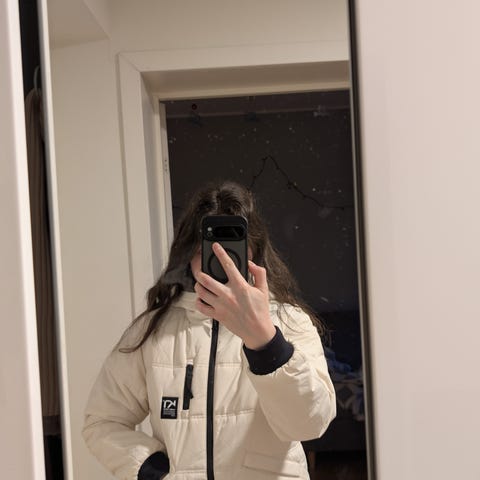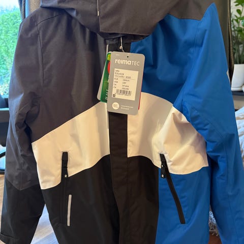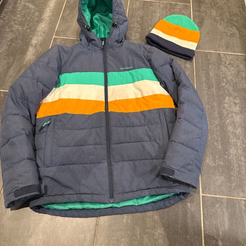 Karitraa barn vinterjakke i størrelse 164, unisex modell. Jakken er hvit og designet for å gi varme og komfort til barn. Den har hette og flere lommer, samt detaljer i svart. Passer for bruk i kaldt vær.