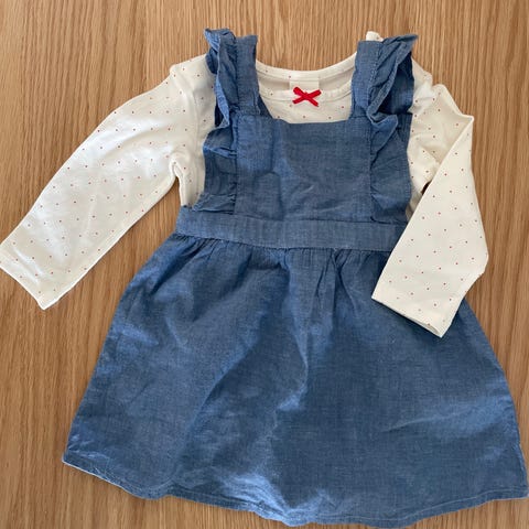 GANT kjole og bloomers i blå bomull, størrelse 68. Settet består av en kjole med rysjekant og matchende bloomers med rysjer på rompa. 100% bomull.