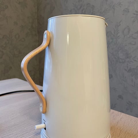 Helt ny og ubrukt Stelton vannkoker i hvit farge med svart lokk, kommer i orginalpakke. Kannen har et tidløst, enkelt og funksjonelt design og har matchende produkter i samme serie.