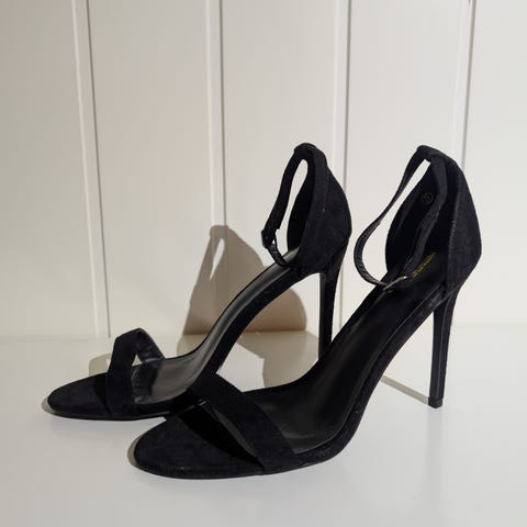 Hæler i størrelse 41, svart farge. Laget i materiale med blank overflate. Klassisk design med spiss tå og smal hæl.