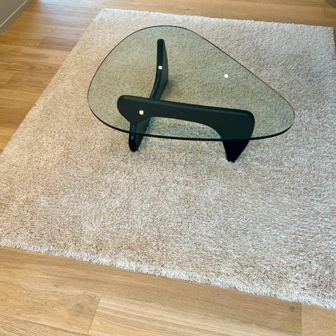 Teppet er rent, pent og godt ivaretatt – ingen synlige flekker eller slitasje. Den mørkere “flekken” på bildet er bare avtrykk fra en puff som har stått der (forsvinner når det luftes ut).