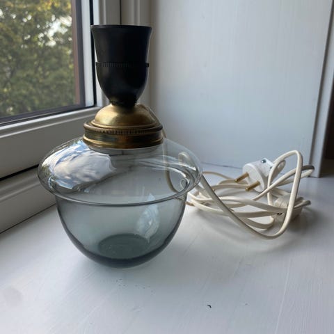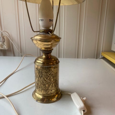 Bildet viser en parafinlampe i messing, en type belysning som var svært utbredt fra midten av 1800-tallet og frem til elektrisiteten ble vanlig.