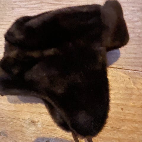 Selger en gammel pels lue/hatt for salg. Tror det er i selskinn men er ikke sikker.