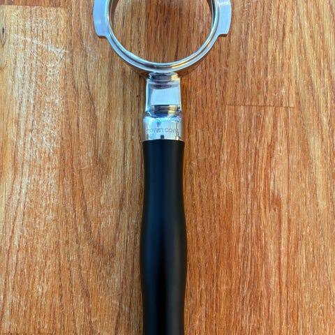 Portafilter for espresso machine with a black handle and metal filter basket. Used for holding coffee grounds during espresso extraction.