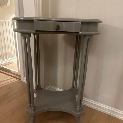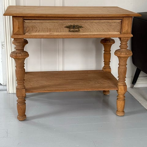 Antikk trebord med en skuffe. Bordet har fire dreide ben og dekorative tverrstag. Overflaten er i tre med synlige bruksmerker. Passer som sidebord eller nattbord. Ukjent alder. Må hentes