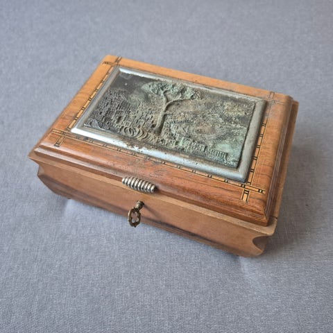 Trekommode med flere skuffer og skapdører, dekorert med metallbeslag og utskjæringer i metall. Kommoden har håndtak og lås, og er egnet for oppbevaring av små gjenstander.