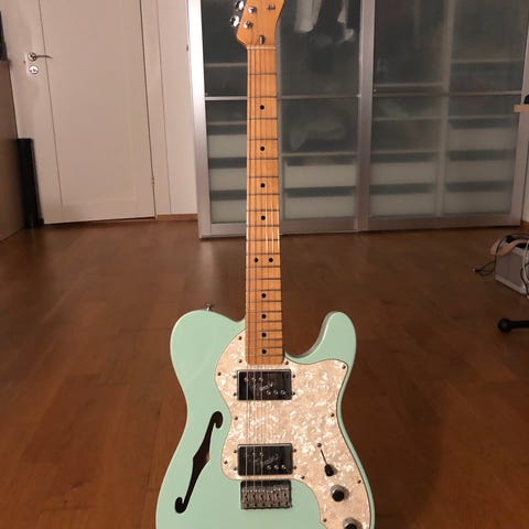 Selger en Godin Stadium HT (handcrafted in Canada) – en skikkelig solid “Tele”-type gitar med fast bro og masse twang/attack. Denne er modifisert og skiller seg ut både visuelt og lydmessig.