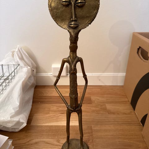 Dette er en tolkning av en Akuaba (eller Akua'ba), et tradisjonelt fruktbarhetssymbol fra Ashanti-folket i Ghana. Mens de originale figurene er skåret i tre, er denne støpt i metall, noe som er vanlig for dekorasjonsgjenstander og moderne kunsthåndverk.