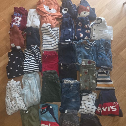 Veldig mye tøy, men som dessverre har en del flekker på flere av plaggene. Mens noe er lite brukt. ellers er alt helt, ingen hull og veldig mye bruk igjen til barnehage f.eks.