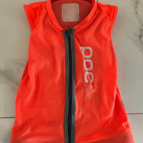 POC POCito beskyttelsesvest/ryggskinne i oransje farge, størrelse S. Egnet for sykling, snowboard og alpinski. Designet for å gi beskyttelse ved aktiviteter som krever sikkerhetsutstyr. Passer for barn fra 100-120 cm