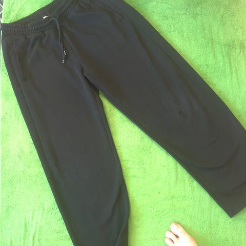 H&M teknisk bukse i strl 38 fra H&M sport. Laget av polyester materiale i svart farge. Passer til hverdagsbruk og trening. Glidelås nederst på bena som gir mulighet for lufting. To lommer på siden med glidelås. Strikk i livet. Buksen gir god bevegelsesfrihet mens man er aktiv. Romslig i størrelsen som gir mulighet for ull under.