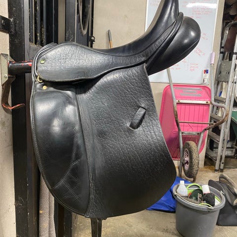 English hearetige Jing Jang Sal. Dette er en sal som er spesial laged for hester med store skuldre og høy manke. Da kappen på undersiden er dratt tilbake. Så du får mindre trykk på skuldrene samtidig som du får den gode støtten. Den er sort, 18 I sete og 32 I bommen.
