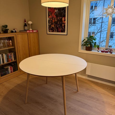Pent brukt spisebord fra Skeidar. Bordplaten er i eikefiner og bein i heltre eik. 150x80 cm.