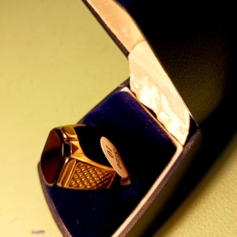 Gullfarget ring med to grønne stener. Den ene stenen litt mørkere i fargen enn den andre. Den har også mange små blanke steiner.