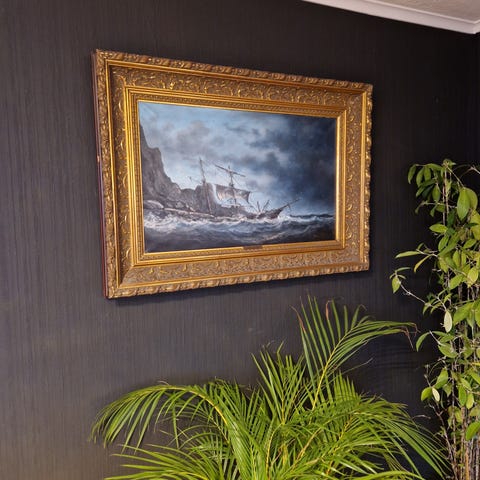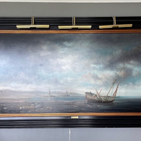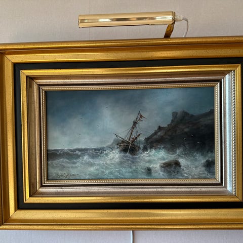 Maleriet "Varhaug gamle kirkegård" av Ivan Storm Juliussen selges til høystbydende over kr 40.000. Målene er 79x50 cm uten ramme.
