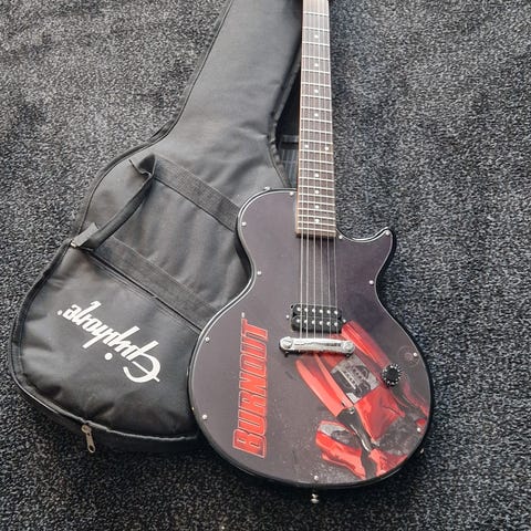 Jack Daniel's elektrisk gitar med svart farge og dekorative signaturer. Gitaren har seks strenger og standard tuning mekanismer. Passer for gitarister som ønsker et instrument med unikt design.