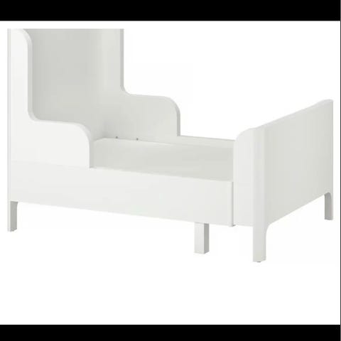 IKEA Loftseng for barn med hvit ramme og grått stoff på sengekanten. Sengen har en stige for enkel tilgang til soveområdet, og er designet for å frigjøre plass under sengen som kan brukes til lek eller oppbevaring.Sengen er ikke satt sammen og er godt tatt vare på. Tekstil er solid, god stand,men synlig brukt.Uten madrass. selges på grunn av flytting. Veldig solid