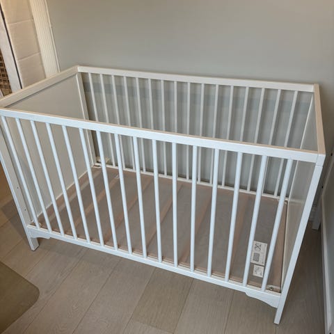 IKEA Sprinkelseng barneseng i hvit farge. Sengen har en enkel og funksjonell design med spiler på alle sider, som gir god ventilasjon og sikkerhet for barnet. Passer for små barn og kan brukes med standard barnemadrass. Materialet er slitesterkt og lett å rengjøre. Madrass, dyne og pute følger med. Kun brukt til barnebarn som har vært på besøk.