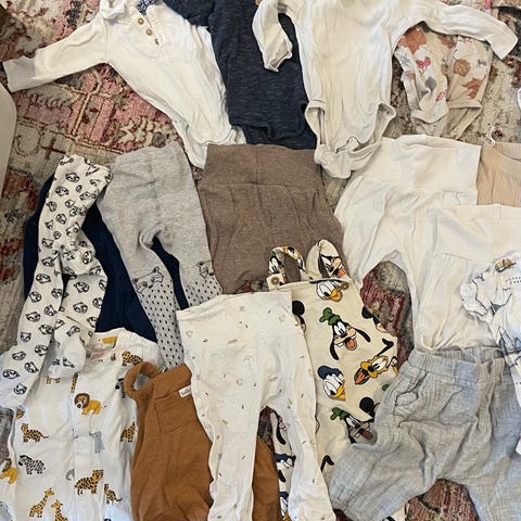 Har en hel pose med nyfødtklær. Mesteparten i prematur 44 som er vasket, brukt hansker og lakt i plastposer inni posen(vet hvor vanskelig det kan vær å vaske hvis en f.eks er på sus). Ville ikke legge alt på gulvet for å ta bilde av alt men er mange ullbodyer, ulldresser og mye fint. Joha, reflex, newbie, name it ++ alt på bilde rundt posen er 50 og 56.