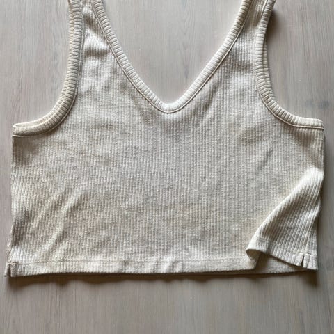 Bik Bok tanktopp i størrelse L, svart farge og laget av bomull. Ribbet mønster. Ikke spesielt lang. Selges uten lapp, men ubrukt. Klipper av lapp før jeg så at den var litt kort, og får derfor ikke returnert.