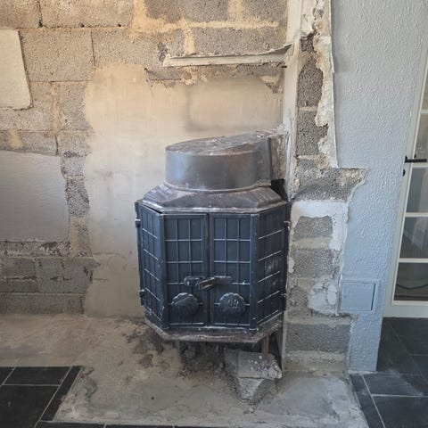 Vedovn laget i støpejern med dør og sider som kan åpnes. Egnet for oppvarming av rom. Har dekorative detaljer på overflaten.