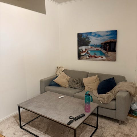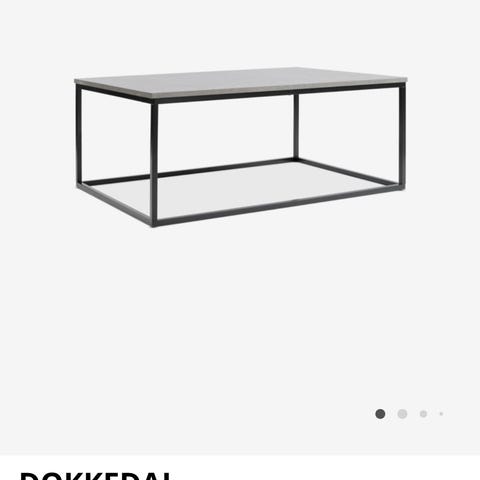 Stort sofabord opprinnelig fra Jysk, modell Dokkedal (se bilde fra nettsiden). Bordplaten er dekket med sort kontaktplast. Denne kan man fjerne dersom man ønsker dette. Merke på den ene kortsiden (se bilde) - usikker på om dette kun er i kontaktplasten eller i bordplata. Må hentes i Ytre Enebakk.