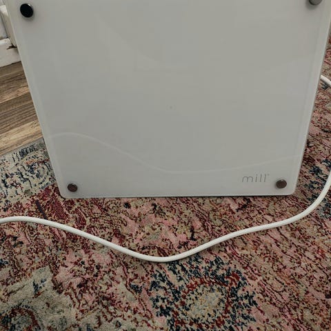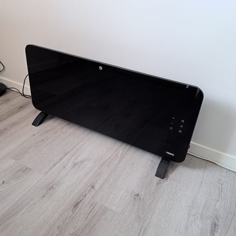 Mill Glass WiFi Glasspanelovn med en effekt på 1000 watt. Panelovnen har glassfront og støtter WiFi-tilkobling for fjernstyring. Den er ubrukt og er i esken