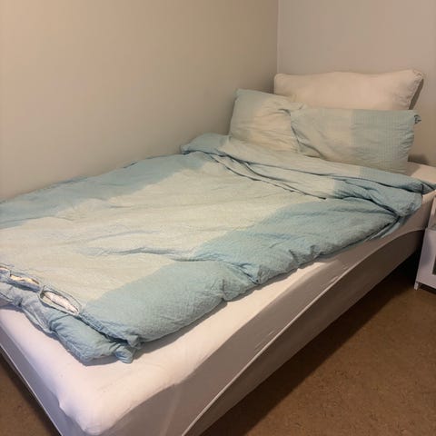 Seng gis bort, den består av to 90cm senger som hører sammen og har en foring som gjevner ut glippen. Godt brukte rammemadrasser med veldig pent brukt overmadrass og væsketett madrassbeskytter. Sengegavl kan følge med om det ønskes. Flekkene på madrassen er avbildet. Må hentes før den 13. Januar