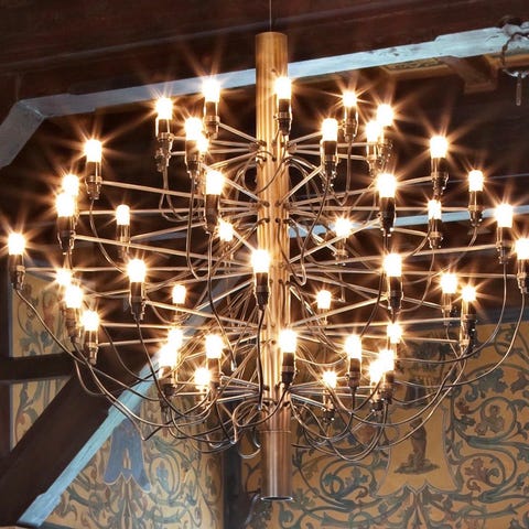 Flos Gino Sarfatti taklampe designet av Gino Sarfatti. Lampen er i krom metall og har 50 lyspærer. Lampen har hengt på samme sted i 4 år, har ingen mangler, og alle lyspærene virker. Lampen kan leveres med gratis frakt i Møre og Romsdal.
