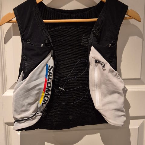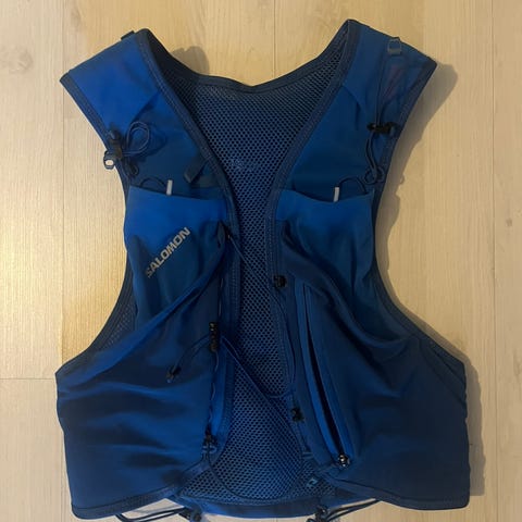 Salomon Advanced Skin 4 løpevest i blå farge, designet for damer i størrelse M. Vesten er laget for løping og har flere lommer for oppbevaring av væske og småting. Materialet er lett og pustende for komfort under aktivitet.