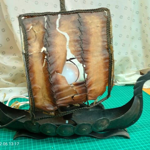 Metall Vikingeskip dekorasjon i svart farge. Seilskute med detaljer som seil, skjold og flagg. Egnet som dekorativ gjenstand, laget i metall selges. Usikker på alder og hvilken type metall den er laget av (ikke tinn). Seilskuten er veldig dekorativ og flott å se på. Skuten er 26 cm. lang og 26 cm. høy. Selges billig, og sendes gjerne som fiks ferdig, og med billig frakt kr. 25,- med posten. Ta kontakt for eventuelle ytterligere informasjon.