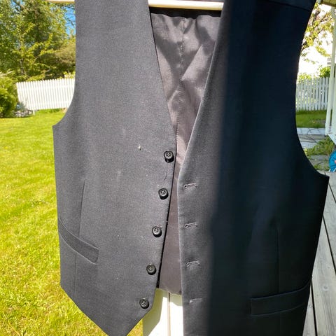 Dressvest for herre i størrelse XS. Vesten er grå på fremsiden med lysblå bakside og linning i matchende glatt materiale. Den har knappelukking foran og to lommer. Justerbar stropp på baksiden. Brukt 1 gang.